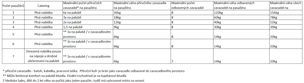 8.4.2 Hmotnostní limity přepravovaných zavazadel jsou uvedeny v příloze. Stanovené limity v příloze jsou orientační, rozhodnutí o umístění zavazadel v letadla je v kompetenci kapitána letadla. Přeprava zavazadel, která převyšují stanovené limity, musí být výslovně odsouhlasena Společností a musí být uvedena v Charterové smlouvě.