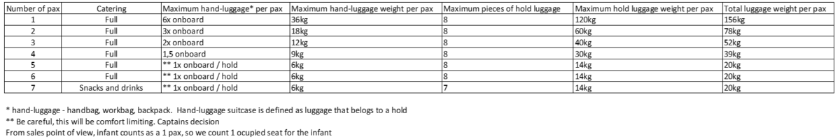 b) Catering for all persons on board according to the offer published on www.atmospherica.aero; except when the capacity of the Phenom 300/300E aircraft is reached (see Annex)
